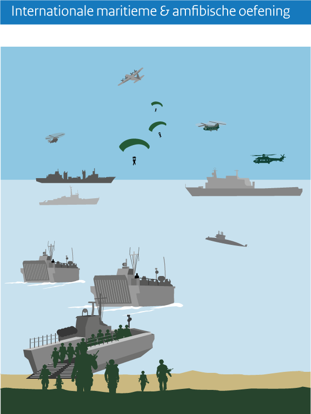 Landingsvaartuigen brengen honderd mariniers naar de kust om in het scenario humanitaire hulptroepen te ondersteunen in een vijandelijk gebied. “Aan boord van de landingsvaartuigen was ook een compagnie Belgische paracommando’s. En mijn Britse counterpart zette het Nederlandse 11 raiding squadron af in het kustgebied.” De jonge luitenant maakte van de gelegenheid gebruik om zijn eigen netwerk te verrijken. Zo stelde hij aan zijn Belgische collega’s voor om een keer in het zuiden van Nederland samen een oefening te draaien. Dat idee viel bij de Belgische paracommando’s in goede aarde en ter plekke wisselden ze telefoonnummers uit. “Informele en formele contacten zijn de basis van een goede internationale samenwerking. En Joint Warrior is daar een prima gelegenheid voor”, vindt Sluis. Als bootgroepcommandant was hij de schakel tussen het zeeoptreden en de grootschalige amfibische operatie, die aan het begin van de oefening plaatsvond.
