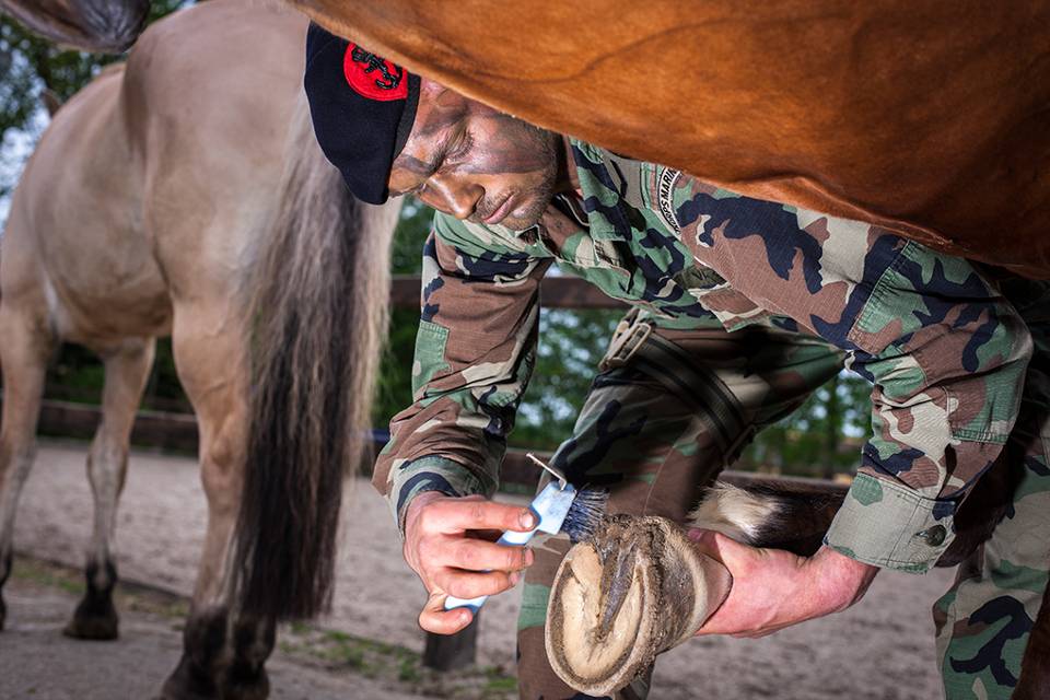 Marinier 1 Tyron Rosina heeft dit ook ondervonden. Nooit eerder heeft hij met paarden gewerkt. Zo wekte een paard dat zijn hoef optilt in het begin een schrikreactie op. Nu weet de marinier dat dit betekent dat hij de hoeven moet uitkrabben. “De eerste dag moest ik echt wennen. Het zijn echt grote dieren. Maar je krijgt hier veel tips en wordt goed begeleid. Na de tweede dag was ik al aan het paard gewend en uiteindelijk is ook nog erg leuk om ermee bezig te zijn op deze manier.”