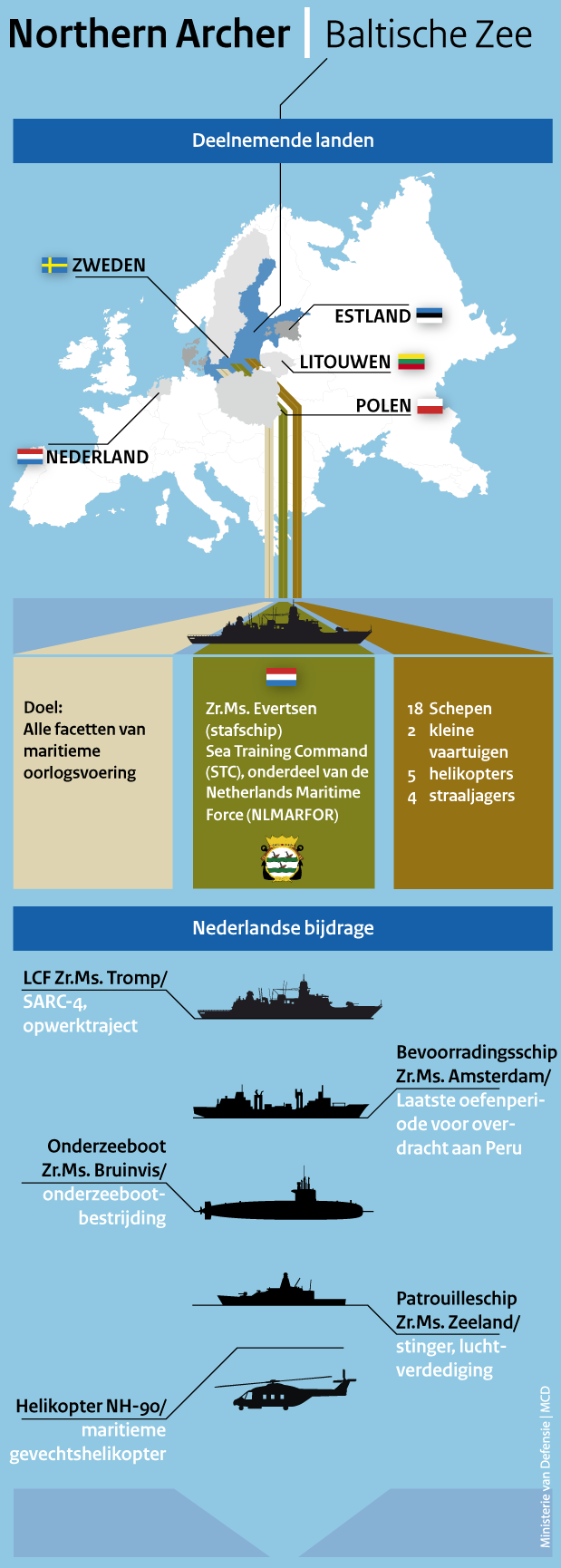 De marinehaven in Den Helder doet in oktober misschien ietwat verlaten aan. Vijf marineschepen varen 4 weken in de Oostzee voor de oefening Northern Archer. Een multifunctionele oefening, waarin de eenheden onder leiding van Sea Training Command hun maritieme oorlogvoeringscapaciteiten verbeteren. Zr.Ms. Tromp, Evertsen, Amsterdam, Zeeland en Bruinvis hebben ieder zo hun eigen uitdagingen in een interessant gebied.