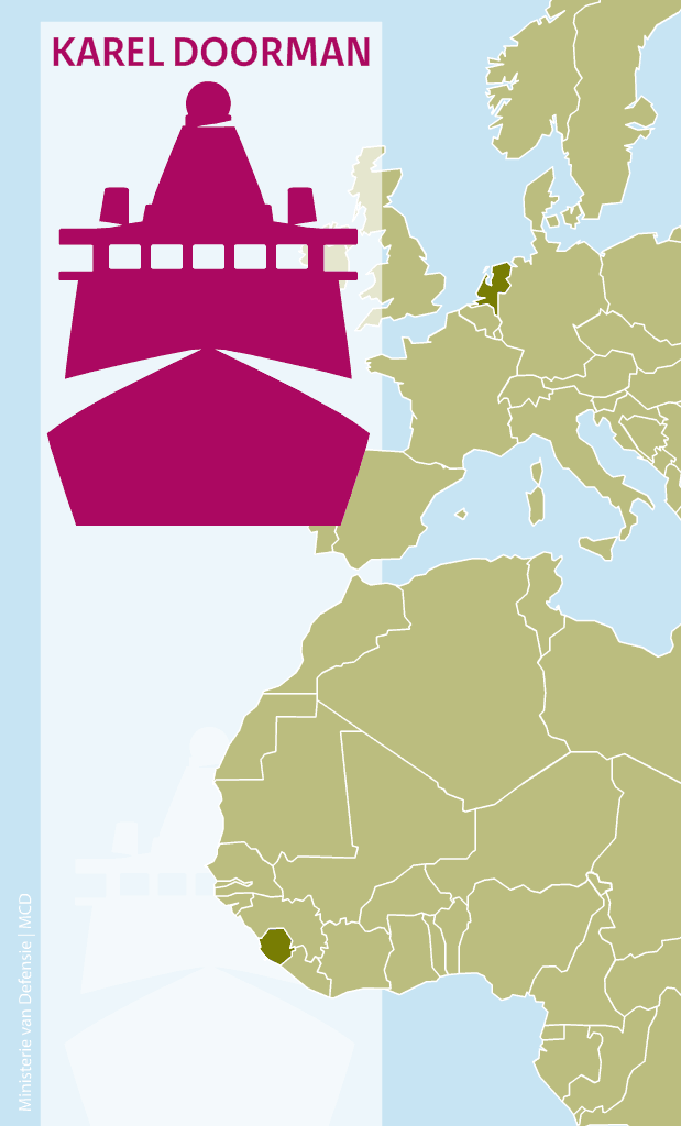 De Karel Doorman is vertrokken naar West-Afrika. Het Joint Support Ship brengt een grote hoeveelheid hulpgoederen voor de bestrijding van ebola naar de regio. Over ongeveer 1,5 week komt het schip aan in de Golf van Guinee. Daar zorgt het voor transporttaken en logistieke ondersteuning van partnerlanden.