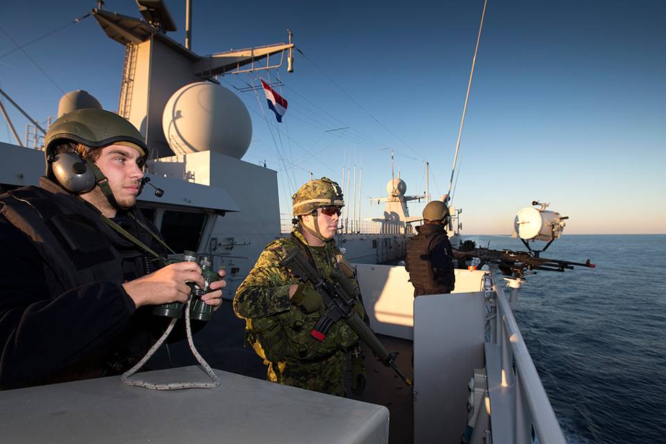 “De staf werkt volledig geïntegreerd samen”, vertelt Kramer. “We stemmen alle operaties goed op elkaar af om een maximaal effect te bereiken, zowel op zee als op land.” Majoor der mariniers Ron Schepel ziet dat vanuit zijn rol als evaluator van de oefening ook terug. “‘Blauw’ (de vloot –red.) en ‘groen’ (de mariniers –red.) zijn in het planningsproces in elkaar geschoven”, legt hij uit. “Daardoor kun je sneller de verschillende stappen in een militaire operatie doorlopen: plan, do, check, act. Het is net als boksen: je moet altijd je tegenstander een stap voor zien te blijven. Als hij knippert, kun jij toeslaan.”