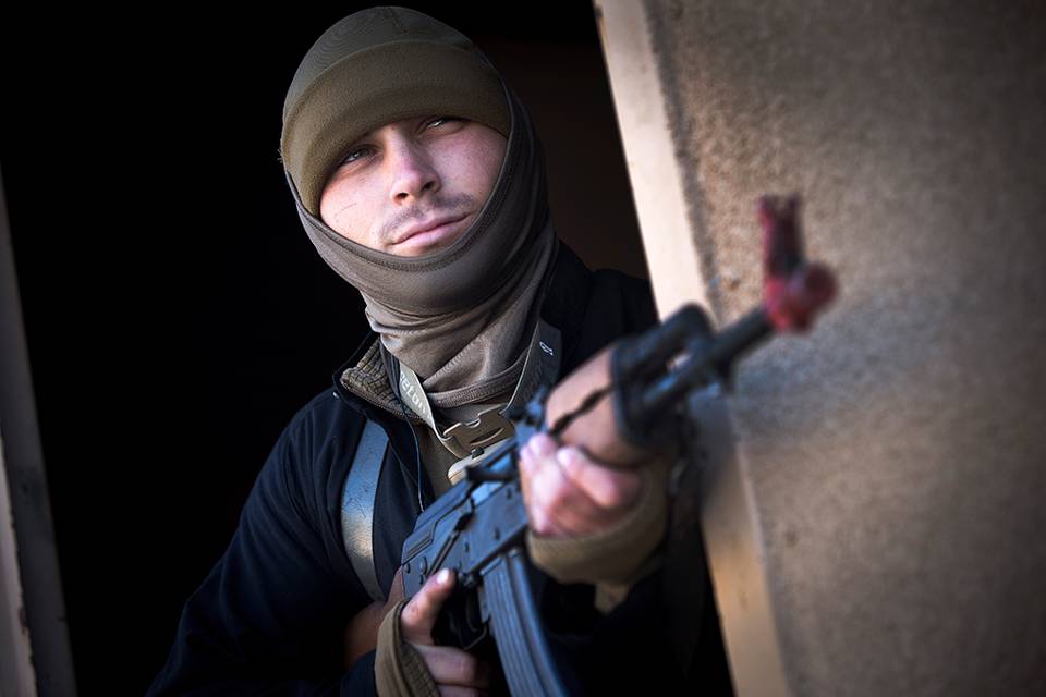 Twee Harrier-jachtvliegtuigen gieren langs Combat Town. Een duo CH-53 Super Stallion transporthelikopters vliegt laag over de boomtoppen. De terroristen-voor-een-dag roeren zich. Eentje rent nog snel de straat over, zoekend naar dekking. Een ander tuurt, gewapend met opplakbaard en AK-47 naar de bosrand. Waar blijven ze?