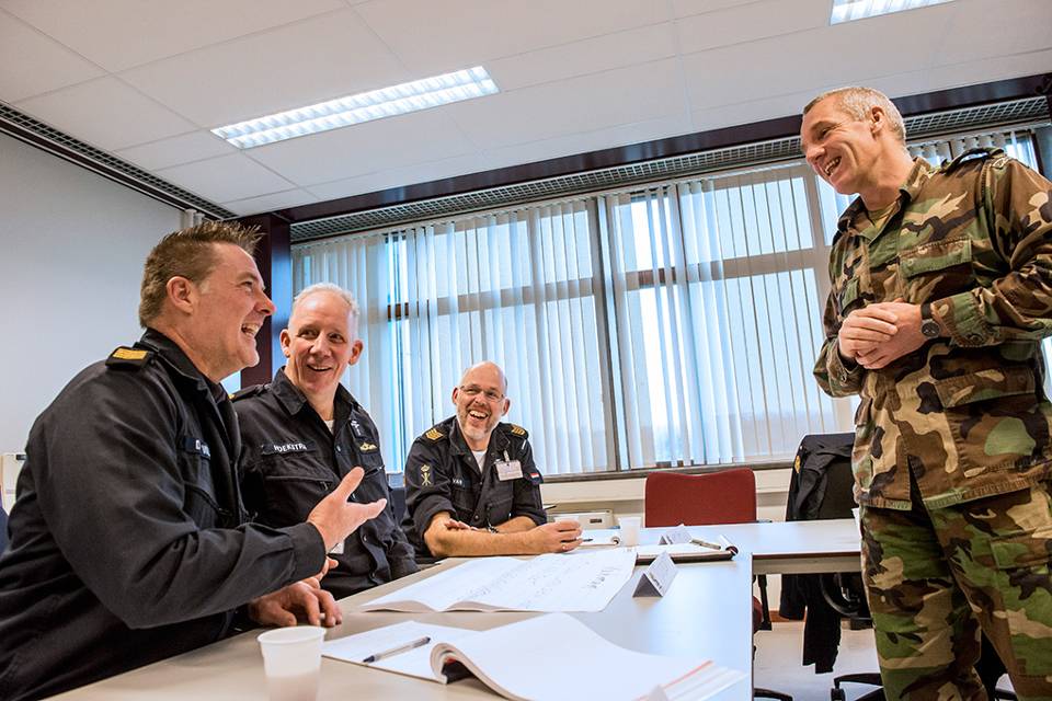 “Het punt is dat deze vier rollen wel te onderscheiden zijn, maar nooit te scheiden. Ze zijn complementair,” vult collega trainer van Alderwegen aan, erop doelend dat een leidinggevende bij confrontatie met een situatie naar gelang het doel elk van de rollen toe kan passen om de situatie naar je hand te zetten. In de zaal begint het kwartje te vallen. Sergeant-majoor Wolf de Wilde: “Ik vind het als vakman briljant om een enthousiaste beginneling naar een ongestuurde professional te coachen. Maar als leider vind ik het soms lastig om conflicten echt aan te gaan.”