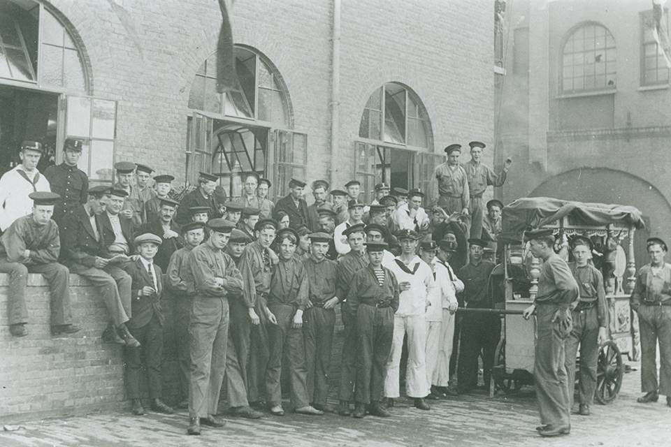 Groepsfoto met matrozen op de Marinekazerne Amsterdam, 1914-1915
