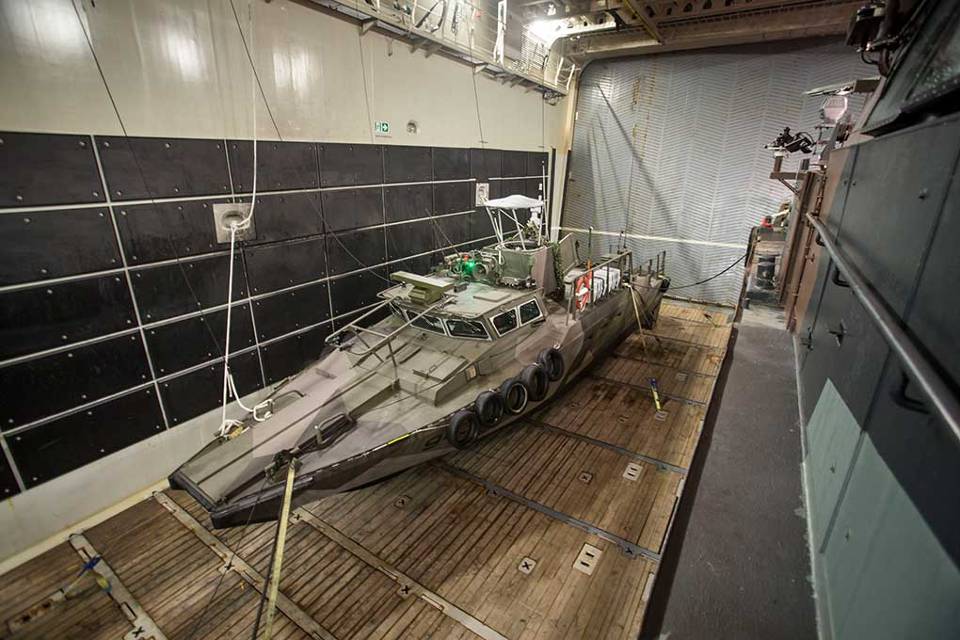 De samenwerking gaat bovendien verder dan het stafniveau. In de scheepshangar staan 2 slanke, gestroomlijnde Zweedse Agusta A109 helikopters. In het landing dock liggen 2 wendbare, snelle CB90 gevechtsboten. De bemanningen van deze Zweedse eenheden werken nauw samen met hun Nederlandse collega’s. Sterker nog, ze zijn geïntegreerd. Vluchten worden samen gepland en op de gevechtsbootjes werken Nederlandse verbindelaars.