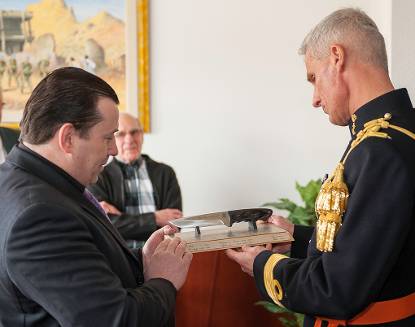 Ter gelegenheid van het jubilerende Korps Mariniers nam BRIGGENMARNS Richard Oppelaar een bijzonder presentje in ontvangst. Op de Van Ghentkazerne kreeg de korpscommandant een gevechtsmes met inscriptie uitgereikt. Dat werd vervaardigd door de bekende Nederlandse messenmaker Albert van den Heuvel. Van den Heuvel, eigenaar van de firma Hill Knives,  besloot een ‘mariniersmes’ te vervaardigen naar aanleiding van het 350-jarig bestaan van het korps én vanwege de band die de mariniers hebben met de stad Rotterdam. Het volledig met de hand vervaardigde gevechtsmes bestaat uit een lemmet van gehard roestvaststaal en een handvat van ijzerhout.