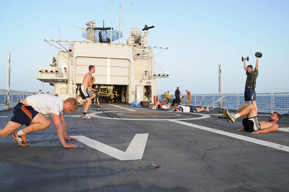 Sergeant-majoor van de mariniers Elwin Wenzel – vliegdekofficier op Maritiem Vliegkamp De Kooy – is opgeleid sportinstructeur en ging op missie met de Van Speijk. Ondanks het gebrek aan respectabele faciliteiten op sportgebied kreeg hij de bemanning dagelijks aan het zweten. “Soms gaf ik circuittraining of cross-fit, een andere keer spinninglessen. Daarnaast gaf ik advies, onder meer op voedingsgebied. Wanneer je intensief sport, moet je goed letten op wat je binnenkrijgt.
