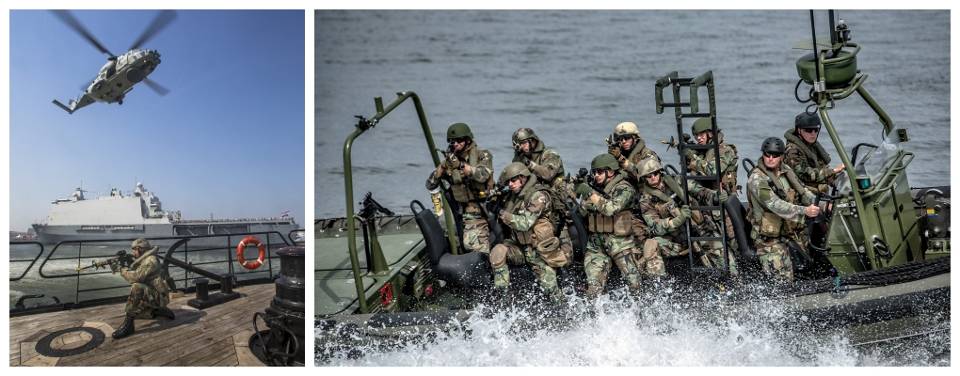Foto links: de maritieme NH90 helikopter zette mariniers af aan dek. | Foto rechts: de Castor is gegijzeld, de bevrijders zijn per FRISC onderweg.