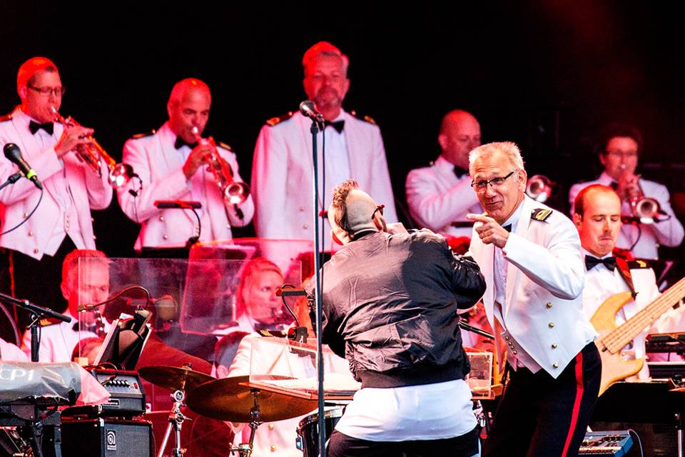 Voor nog meer deining zorgde de gezamenlijke optredens met, om te beginnen, Waylon. Vooral zijn cover van ‘Sailing’ was én toepasselijk én fraai uitgevoerd, inclusief een rafelrandje á la Rod Stewart. Daarna was het vol gas voor de Haagse rocklegende Barry Hay en het orkest van de mariniers. De botsing der culturen kwam aansluitend vooral door de wonderlijke combinatie van de MARKAP en het rauwe rappersduo Kernkoppen. Hoewel, volgens de gebroeders Van der Steen van de hiphopformatie smaakte deze uitvoering van ‘Come with me’ naar veel meer. Dat laatste vond ook leadzanger Marcel Veenendaal van Di-rect, bij wie het ‘Awesome!’ uit zijn tenen kwam, waar het ging om het gecombineerde optreden. Tijdens ‘Invincible’, ‘Times are changing’en ‘Walk with me’ spatte de energie dan ook echt van de bühne.