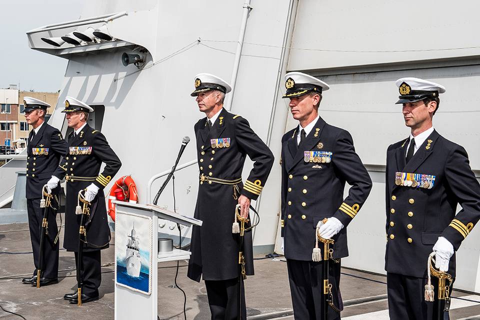 Aan boord van Zr. Ms. De Zeven Provinciën heeft KTZ Boudewijn Boots (2e van links) op 26 juni het commando over het Sea Training Command (STC) en het ‘groepsoudsteschap’ over de Groot Boven Water eenheden overgedragen aan ranggenoot Arjen Warnaar (3e van rechts). STC draagt zorg voor het opwerken en aftesten van schepen en bemanningen van grote bovenwaterschepen, onderzeeboten en kleine bovenwatereenheden. Boots wordt in zijn volgende functie Hoofd Operationele Planning bij de Defensiestaf in Den Haag. (Foto: John van Helvert, Mediacentrum Defensie)