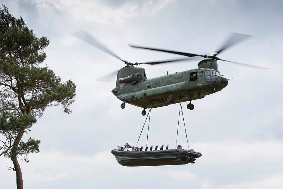 Een test ‘op de limieten’ van de Chinook-transporthelikopter. Dat was de vlucht met de snelle boot van het type FRISC van het Korps Mariniers. Deze underslung-test vond plaats op 18 juni en verliep goed. Het zou de aanloop kunnen zijn naar een nieuw concept van opereren voor onze Maritime Special Operations Forces. (Foto: Mediacentrum Defensie)