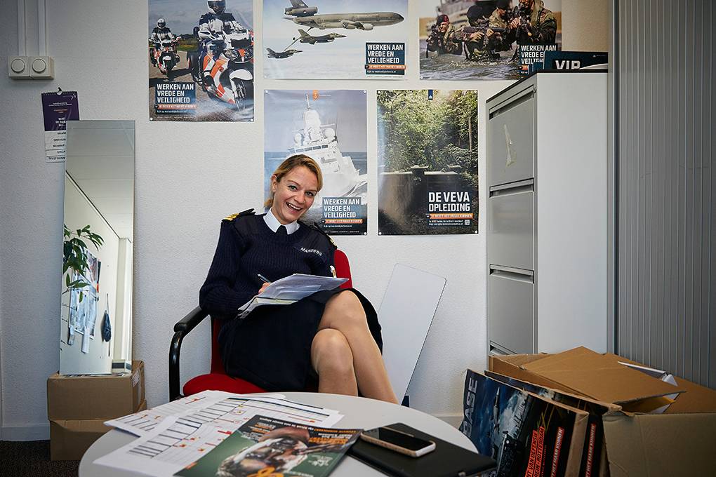 Dat ze als marinevrouw in hart en nieren ‘paars’ werkt, vindt Manders prima. Het is zelfs een must om te weten te komen welke functies de krijgsmacht herbergt, zodat ze de inhoud ervan adequaat kan ‘vertalen’ naar sollicitanten. “Meestal slaat ons verhaal wel aan, al houd je altijd mensen die Defensie bij nader inzien niets vinden”, weet Manders, die veel voldoening uit haar baan put. Ze krijgt volop de gelegenheid om creatief bezig te zijn en ideeën in te brengen. Terwijl ze bij haar aantreden juist twijfelde of dit wel kon. “Ik verwachtte dat het ‘uitvoeren mars’ zou worden, wat dus niet bleek te kloppen; ik krijg juist veel vrijheid.”