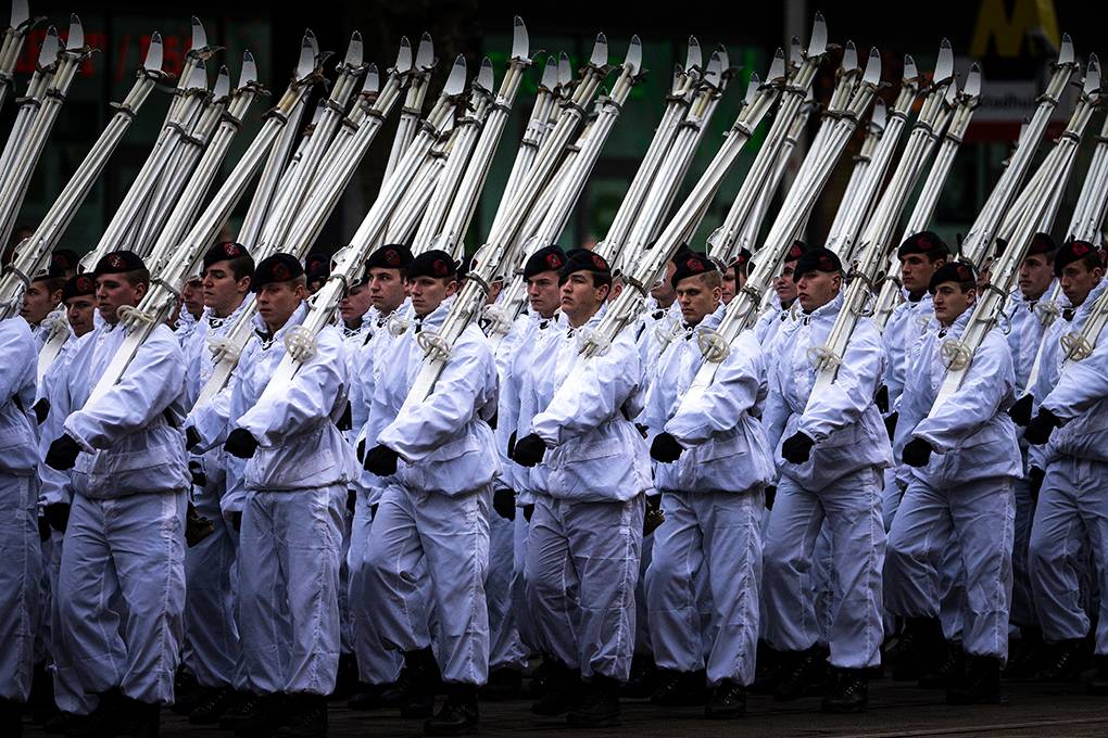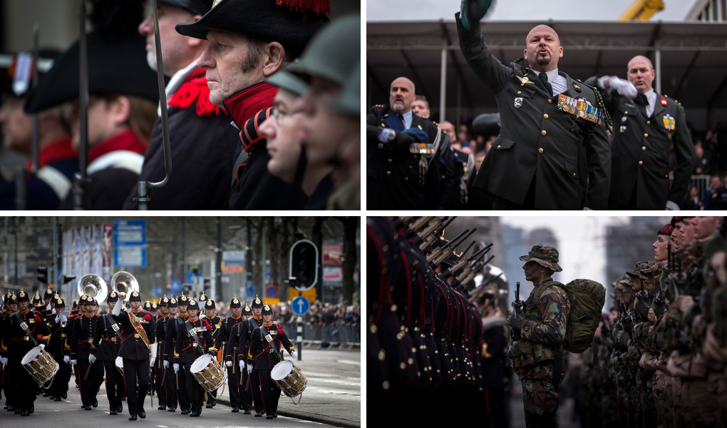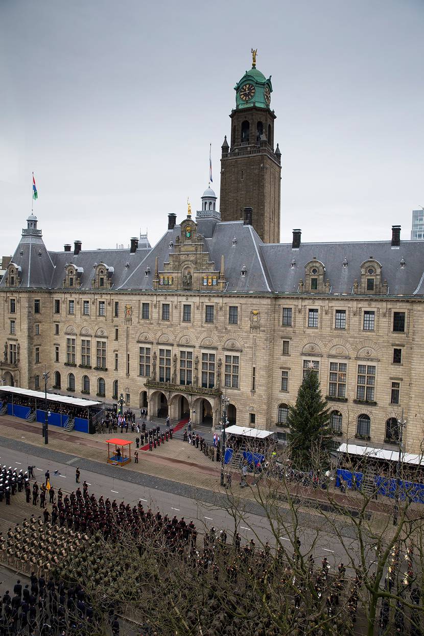 “Rotterdam lijkt wel een oorlogsgebied”, merkt een voorbijganger op. 4-tonners blokkeren de toegangswegen naar de Coolsingel, Volkswagens Amarok rijden af en aan en op elke straathoek staan militairen met de karakteristieke blauwe baret met rood padje en de rode bies op de broek. Onder begeleiding van de Marinierskapel en de Tamboers en Pijpers komen 2.000 (oud)-mariniers aangemarcheerd. Ze stellen zich op voor het Rotterdamse stadhuis.