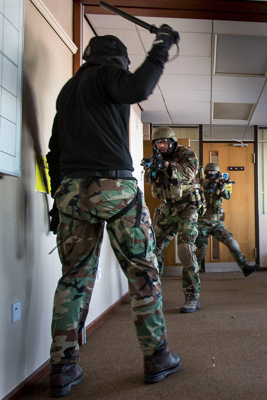 Ray gooit een advies in de groep. “Overzie de situatie en trek dan pas je plan. Houd het eenvoudig en denk inderdaad aan de juiste benamingen. Ik heb te vaak ‘go’ gehoord in plaats van ‘move’. Dat laatste is beter, want ‘go’ lijkt teveel op ‘no’.” Waarna de gemaskerde cursisten behoedzaam verder schuifelen. Geen kamer, gang of nis ontsnapt aan hun aandacht. Ray: “Het is belangrijk om niet alleen via het boekje te werken, maar ook op basis van je praktijkervaring. Dat boekje is slechts een leidraad.”