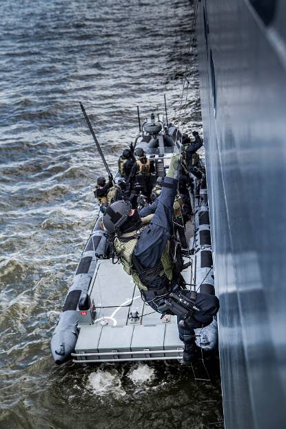 Iedere deelnemer aan deze havenbeschermingsoefening traint zo zijn specifieke ‘skills & drills’ en daar bovenop de samenwerking met de partners. “Dat maakt dit scenario zo uitdagend”, stelt luitenant-kolonel der mariniers Jur van Nee, commandant NLMARSOF. “Als NLMARSOF beschikken wij over de mensen, middelen en technieken om iedere vorm van dreiging op en rond het water te bestrijden. Dat doen we veelal samen in DSI-verband. Die samenwerking met politiemensen is van enorme meerwaarde bij ons optreden.”