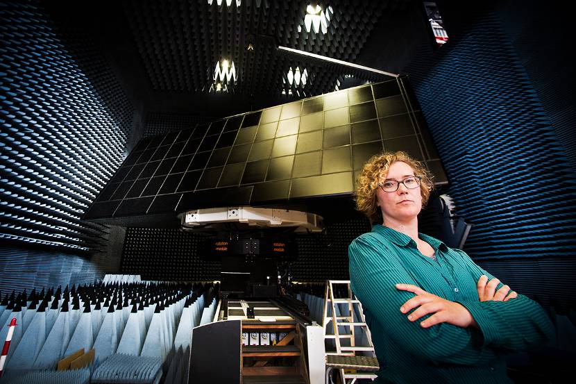 Ronana Vermeulen met achter haar zogeheten energieabsorbers. Die dienen om tijdens een test de energie in de werkplaats te dempen, zodat er geen verkeerde radarreflectie optreedt.