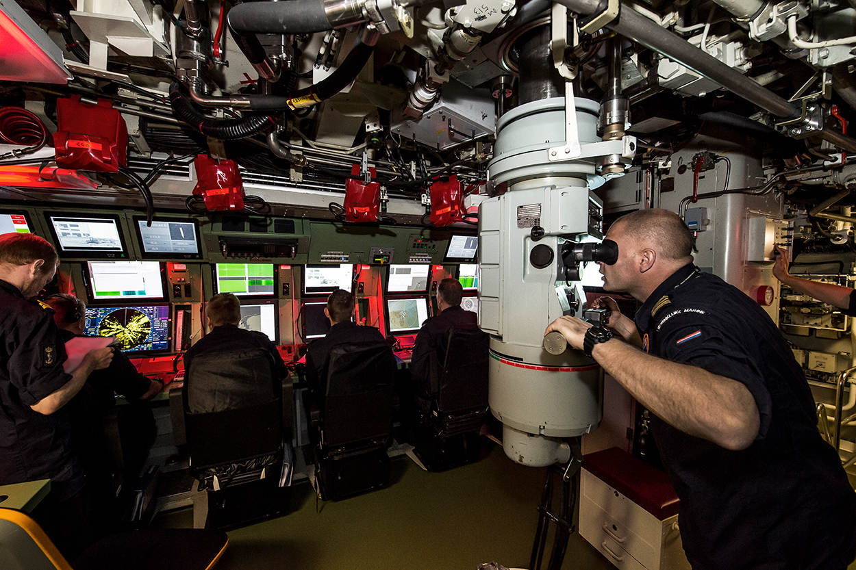 Een groot deel van de modificaties van het Instandhoudingsproject Walrusklasse heeft betrekking op de werkstations in de commandocentrale. Op de achtergrond de optronische mast die de oude vertrouwde periscoop vervangt.