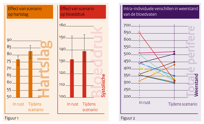 De resultaten tonen dat de adelborsten tijdens de scenario’s een hogere hartfrequentie en een licht-verhoogde bloeddruk lieten zien ten opzichte van een rustsituatie (zie figuur 1). Deze stijging duidt meer op positieve dan op negatieve stress. Die conclusie wordt ook bevestigd door de prestatiebeoordelingen van de instructeurs: Er valt binnen de groep adelborsten geen significante afname in prestatie waar te nemen.