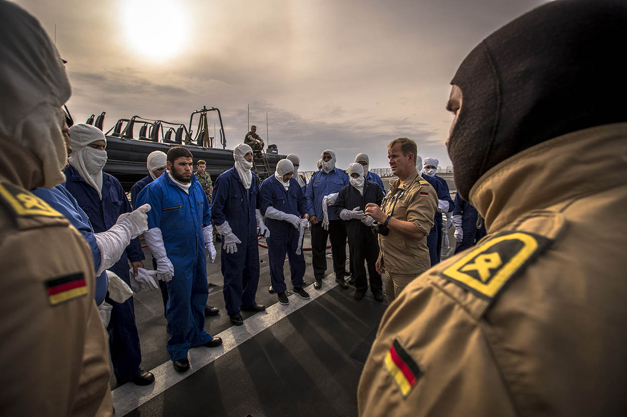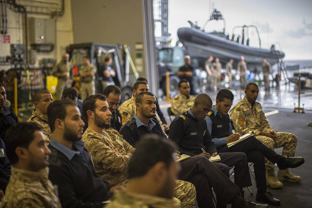 Voor de een leek lijkt de boarding van een Nederlands Landing Craft Utility door Libische trainees op totale chaos. Maar de Britse sergeant-instructeur toont zich tevreden. Met een ‘thumbs up’ beloont hij het doorzoeken van het landingsvaartuig en het fouilleren van de bemanning op volle zee. Richt EU-operatie Sophia zich van origine op het tegengaan van mensensmokkel in het centrale deel van de Middellandse Zee, met de komst van Zr. Ms. Rotterdam komt er een taak bij: Libische kustwachters bijscholen.