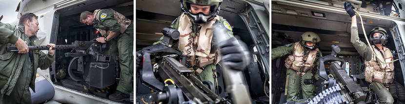 “Afhankelijk van de missie wordt bepaald welke boordmitrailleur de NH90 meeneemt, de MAG of de M3M”, zegt sergeant-majoor Piet. Als sensor-operator heeft hij onder andere de taak het bedienen van de MAG-boordmitrailleur. “De M3M is veel krachtiger. Een schot voor de boeg is hierdoor dreigender. Het is een nog duidelijker waarschuwing aan piraten of drugskoeriers.”
