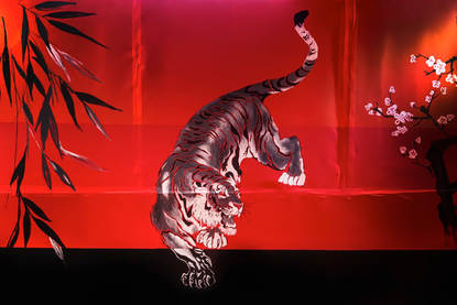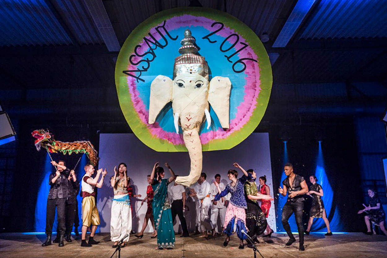 De avond begint traditiegetrouw met het ‘showtje’. Tijdens deze voorstelling reizen de gasten dit jaar in sneltreinvaart door China, India, Mongolië en Indonesië. Buikdanseressen, strijders en ninja’s passeren de revue. Begeleid door trommels, viool en klarinet. Dansers rennen met immense draken, zwaarden en vlaggen over het podium. Zichtbaar loodzwaar, een hindernisbaan is er niets bij.