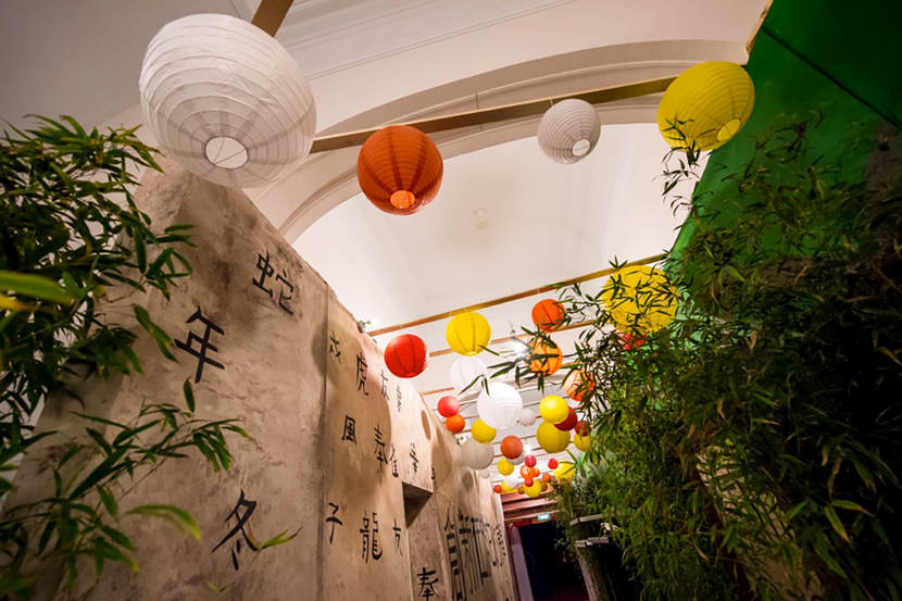 Telkens komen grote schalen sushi, frituurhapjes en broodjes hete kip voorbij. Mensen staan gezellig op de Chinese muur te praten, terwijl een groepje adelborsten voor een Japanse vijver met bier proost op een succesvolle avond. Ondertussen wordt er rustig gepraat in de boeddhistische tempel en voor de Taj Mahal whiskey geproefd.