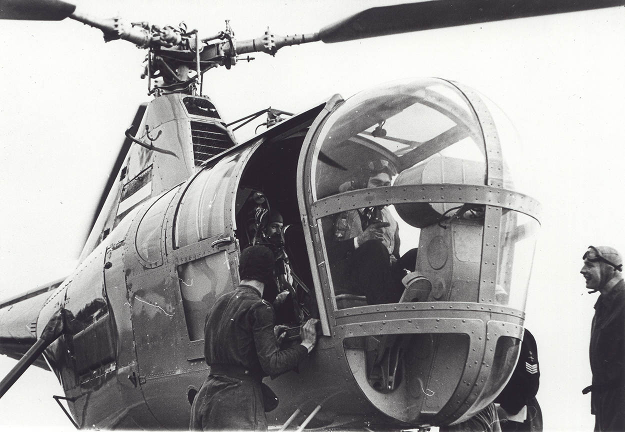 De Sikorsky S-51 Air Sea Rescue-trainingshelikopter H 1 Jezebel, ten tijde van de eerste vlucht vanaf Hr. Ms. Karel Doorman, met de vliegers Idzerda en Swarts. Met de Jezebel werden tijdens de Watersnoodramp van 1953 vele reddingen verricht.