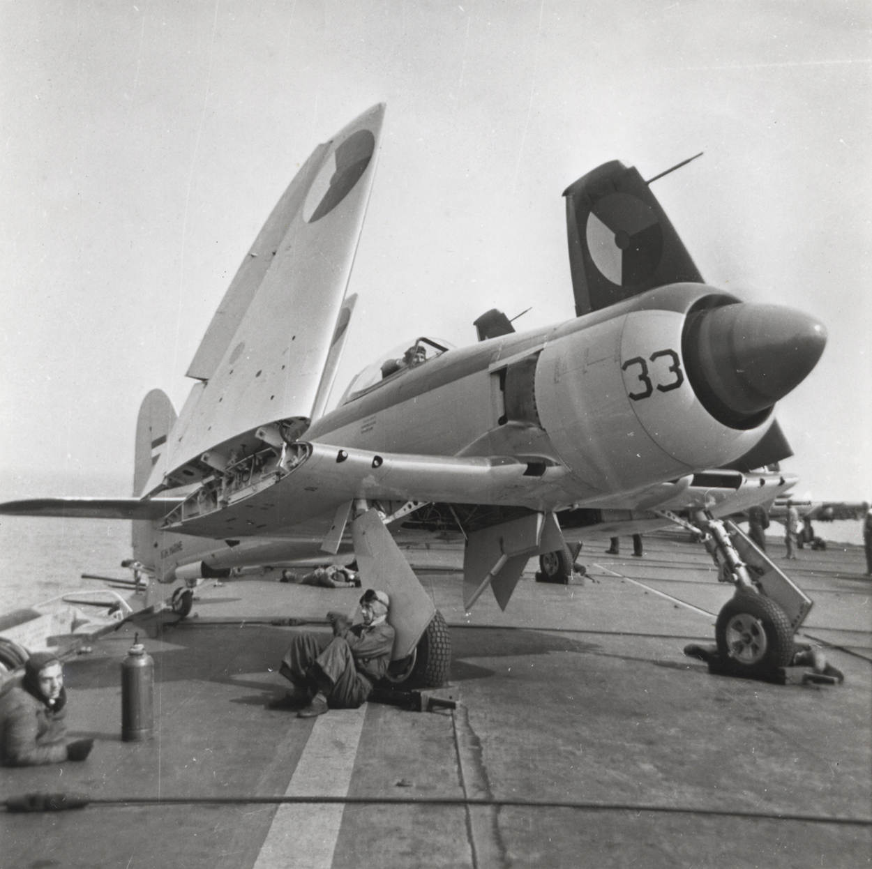 Carrier-jachtbommenwerper Hawker Seafury FB.Mk.51 F 33 aan boord van vliegkampschip Hr. Ms. Karel Doorman. Let vooral op de 'blokkenpaai'.