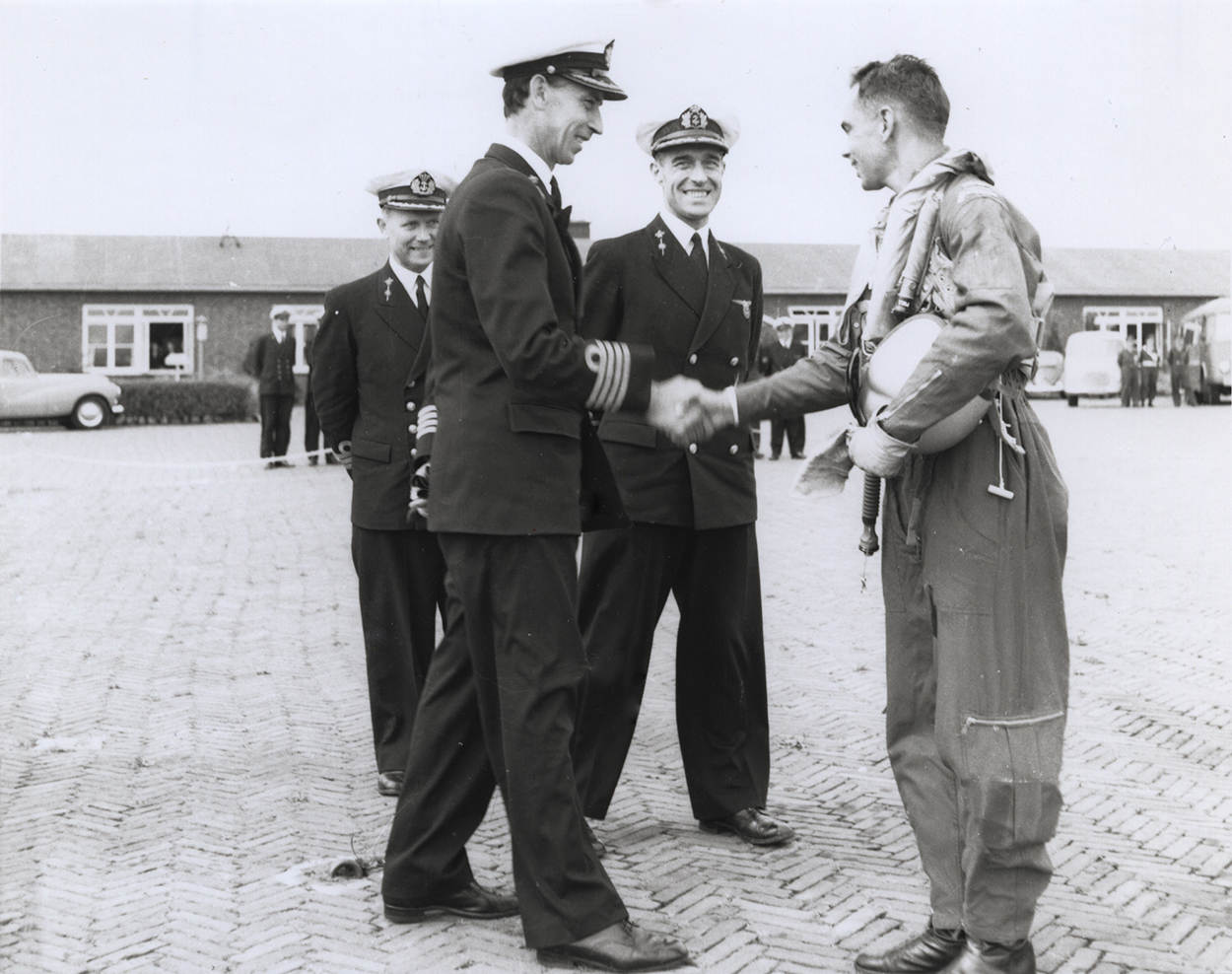 Aankomst van de eerste Hawker FGA-50 Seahawk carrier-jachtbommenwerper op Marinevliegkamp Valkenburg. KTZV Witholt, commamdant MVKV, heet de LTZV 1 Idzerda welkom.