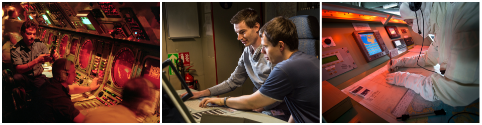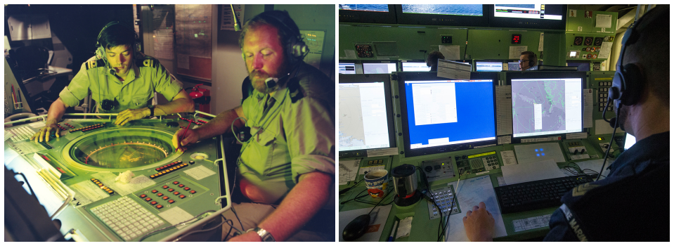 Foto links: Zr. Ms. van Amstel brengt met moderne IT vluchtelingenstromen bij Griekenland in kaart. Foto rechts: De commandocentrale aan boord van onderzeeboot Hr. Ms. Tijgerhaai (1972-1992).