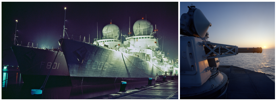 Links: de geleidewapenfregatten Hr. Ms. De Ruyter (1976-2001) en Hr. Ms. Tromp (1975-1999) met hun innovatieve 3D-radarbol. Rechts: een sterk staaltje Nederlandse maritieme innovatie, de Goalkeeper.