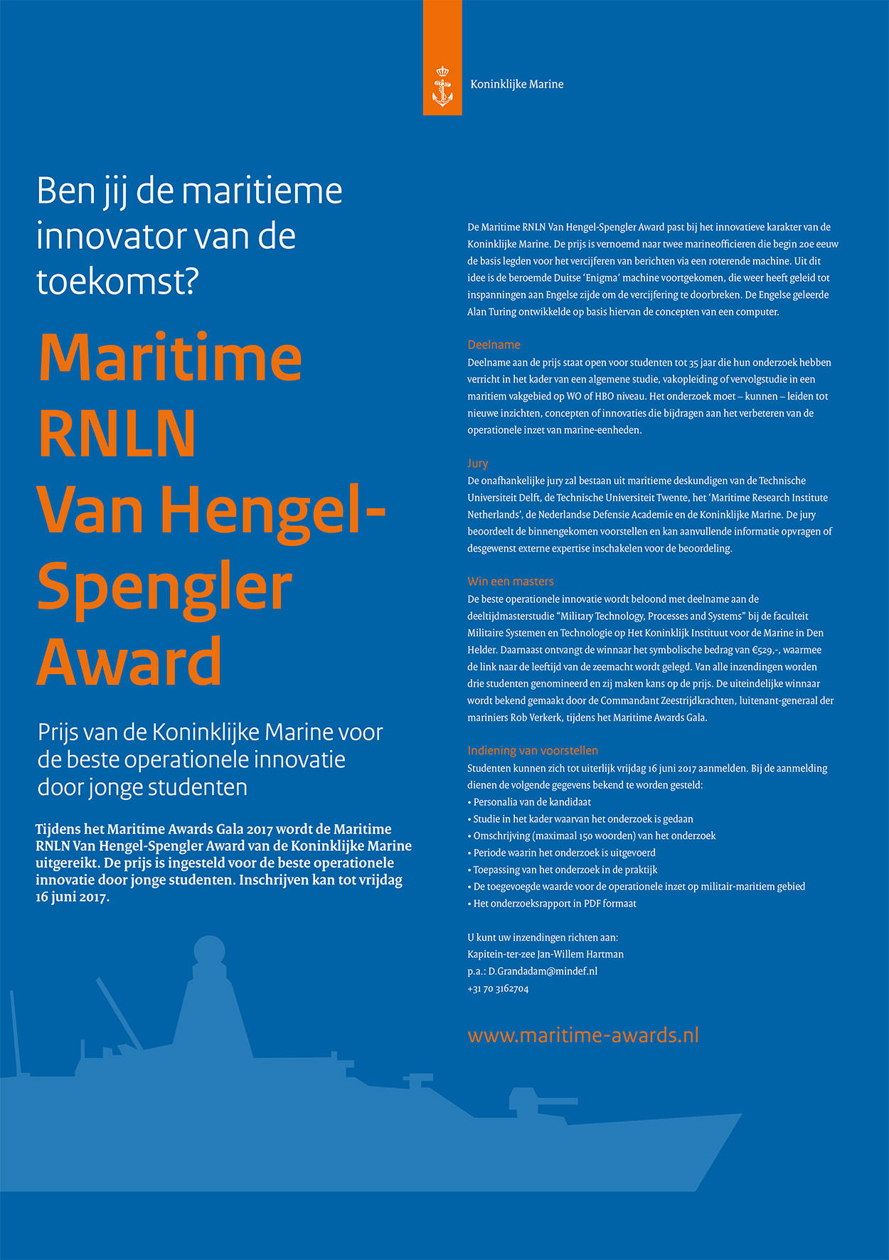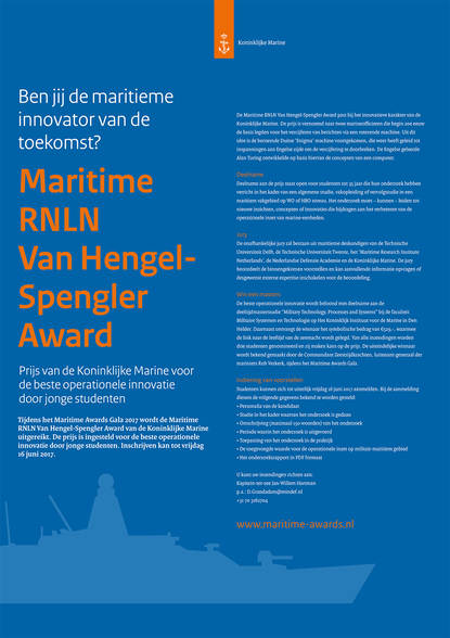 Tijdens het Maritime Awards Gala 2017 wordt de Maritime RNLN Van Hengel-Spengler Award van de Koninklijke Marine uitgereikt. De prijs is ingesteld voor de beste operationele innovatie door jonge studenten. Inschrijven kan tot 16 juni.