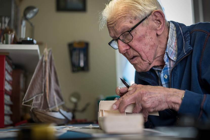 Herman Witteveen spendeert al zijn hele leven veel tijd aan het repareren en maken van scheeps- en vliegtuigmodellen. Zo heeft hij eindeloos veel uren besteed aan de productie van schaalversies van Hr. Ms. Karel Doorman I (ex-HMS Nairana 1946-1948) en de bekendere Karel Doorman II (ex-HMS Venerable 1948-1968). Eind april heeft het bestuur van de Stichting Vrienden van de Traditiekamer deze 2 modellen geschonken aan het Joint Support Ship Zr. Ms. Karel Doorman. Commandant KTZ Sim Schot (foto) van de huidige Karel Doorman en een deputatie van de bemanning toonden zich zeer verguld met de geschenken.