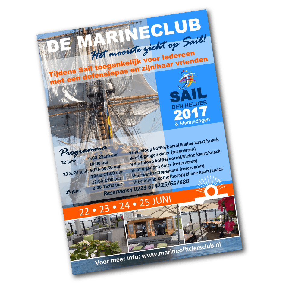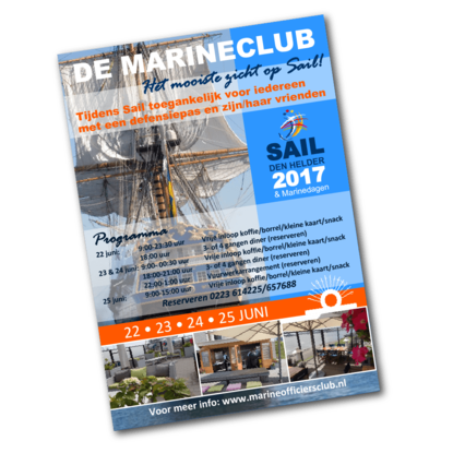 Een bijzonder moment voor de Marineclub. Tijdens SAIL Den Helder/Marinedagen (22 t/m 25 juni 2017) opent de besloten club de deuren voor iedereen met een Defensiepas plus zijn of haar vrienden en familie. “Dan zit je hier echt op de eerste rij; de schepen varen bijna over je benen heen”, aldus Voet. In het Grand Café en op het terras kun je vrij inlopen. Wie wil genieten van een diner in het restaurant doet er goed aan te reserveren.