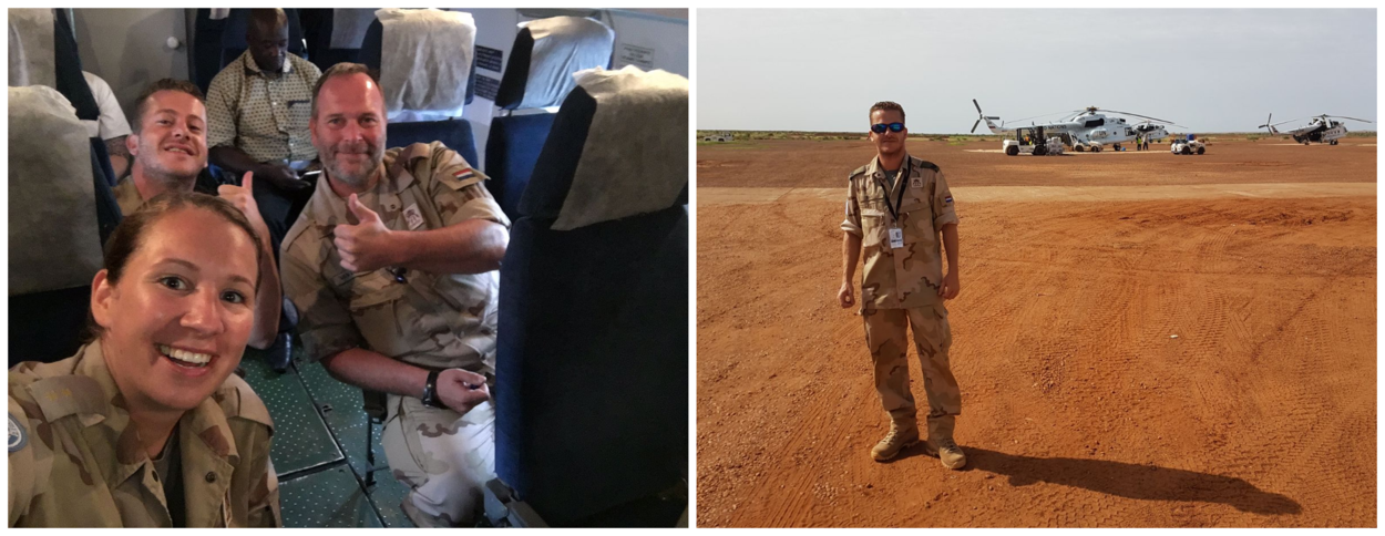 Links en rechts: Rick op een VN-vlucht naar Gao, samen met verwerver Elma en controller Guus, die over digitale betalingen gaat. Gedrieën vormden ze een soort ‘financiële task-group’.