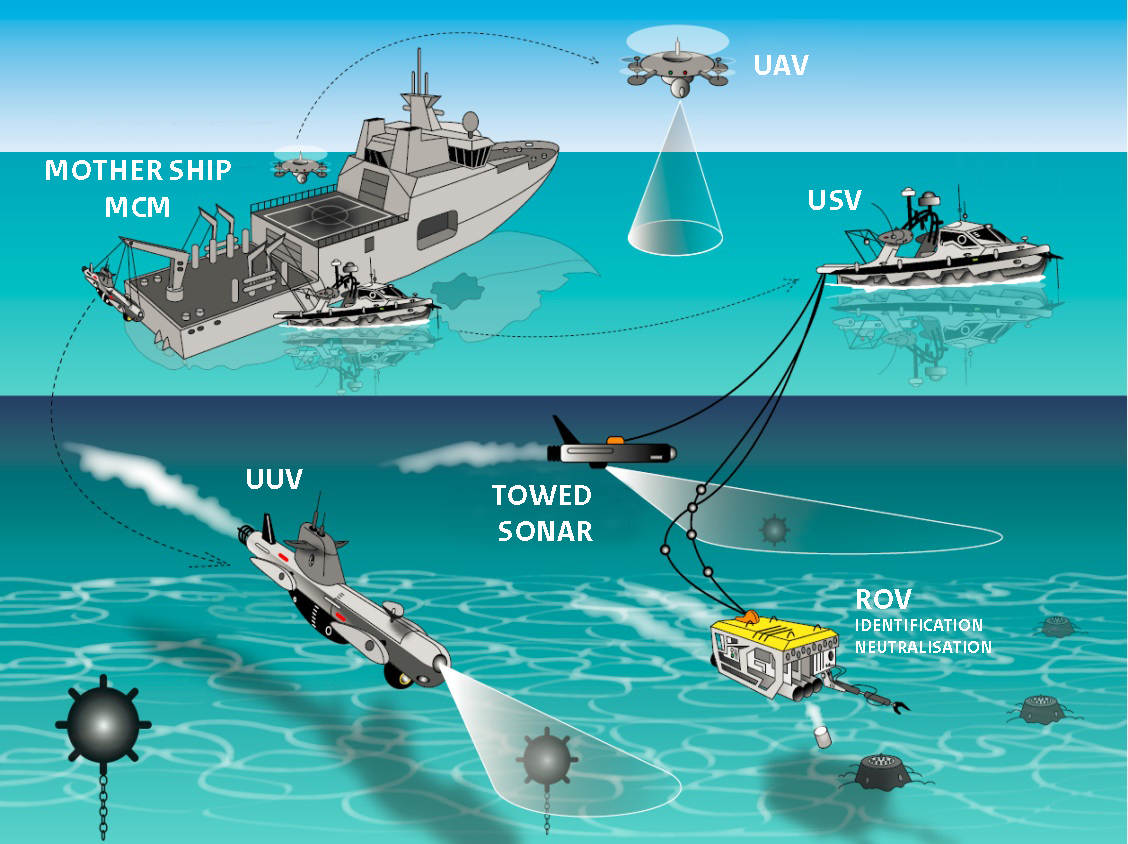 Een 90 meter lange mijnenjager opereert op zee. Verder vooruit vaart een onbemand bootje dat een geavanceerde sonar achter zich aan sleept. Onder water speurt een autonoom onderwatervaartuig de bodem af naar explosieven. In het ondiepe water, dichter bij de kust, voeren duikers van het Very Shallow Water-team een heimelijke verkenning uit. Boven in de lucht hangt een drone die het gebied in kaart brengt. Een idyllisch toekomstplaatje? Het is dichterbij dan we denken, volgens beide commandanten.