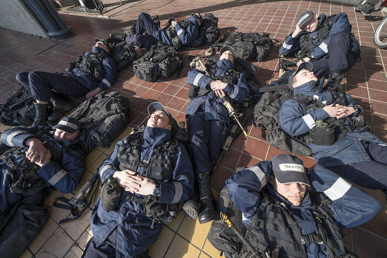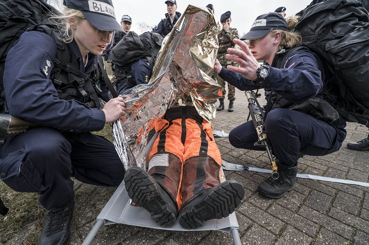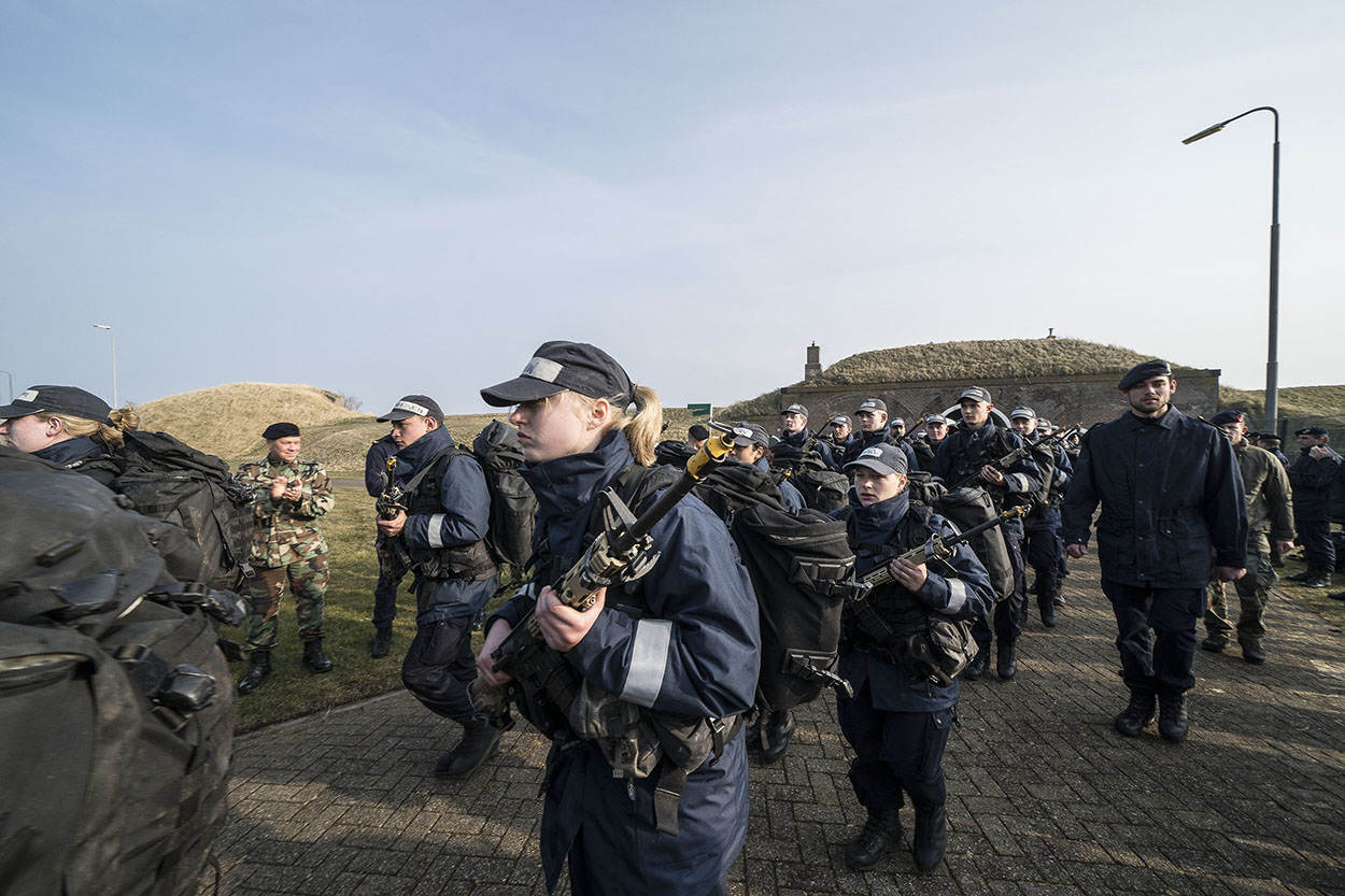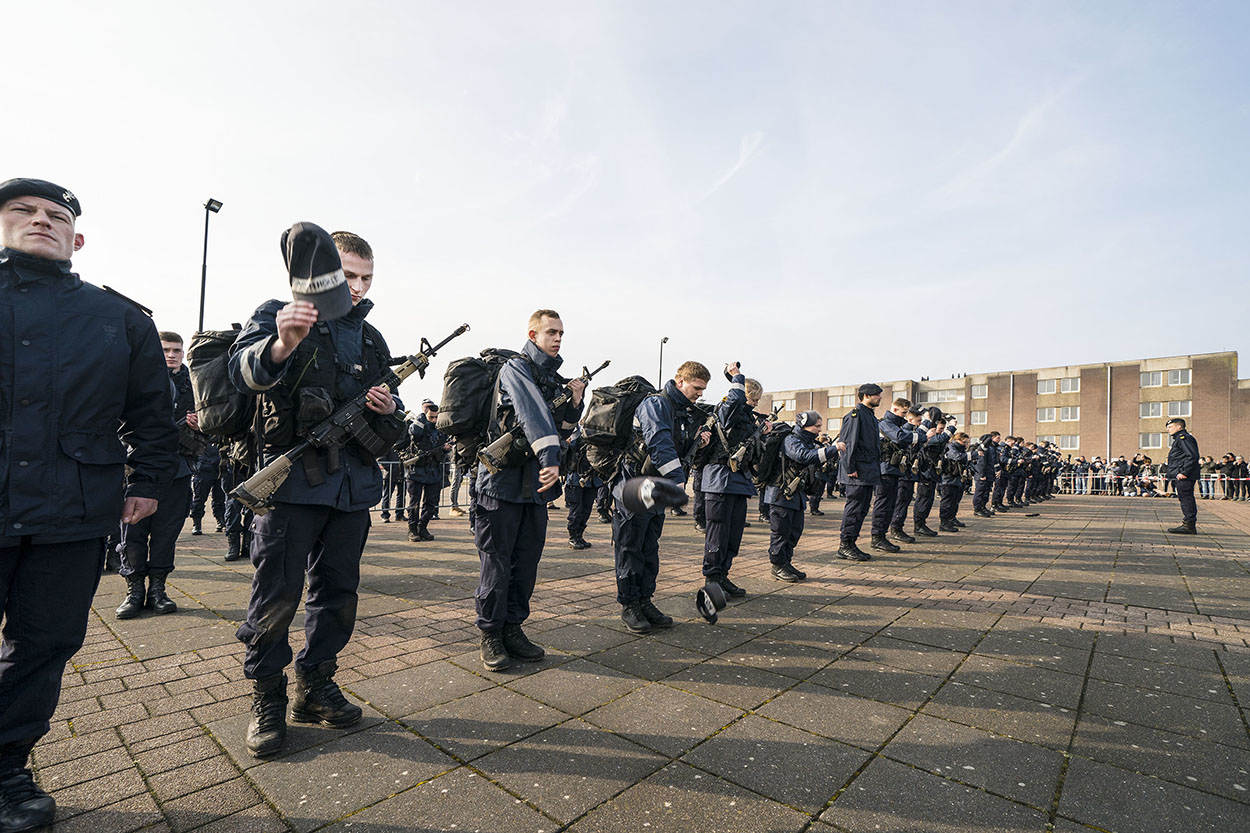 De laatste kilometers zijn ingegaan. De kazerne is in zicht. De zon probeert voorzichtig door de wolken te komen. Een symbolisch teken? Voor enkelen, die heel diep zijn gegaan vandaag, waarschijnlijk wel. Zij lopen bijna letterlijk op hun tandvlees, maar zo trots als een pauw de historische Keelpoort van Marinekazerne Erfprins binnen. Enthousiast onthaald door collega’s en geliefden. De volharding zit erop, de EMMV is afgerond. “Petten af, baretten op!” Een laatste bevel dat de nieuwbakken matrozen met alle liefde uitvoeren.