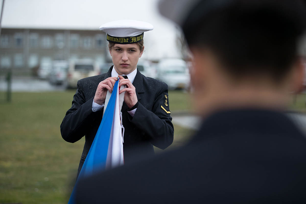 De vlag wordt op 28 maart voor de laatste keer neergehaald. Marinekazerne Vlissingen gaat sluiten. Het wachten is in Zeeland op de bouw van de Michiel Adriaenszoon de Ruyter-kazerne. (Foto: SGT Hille Hillinga)