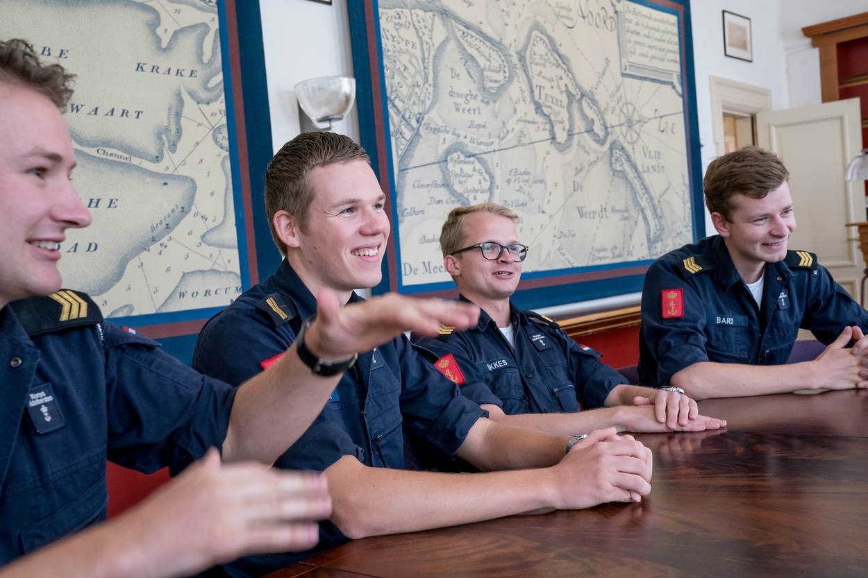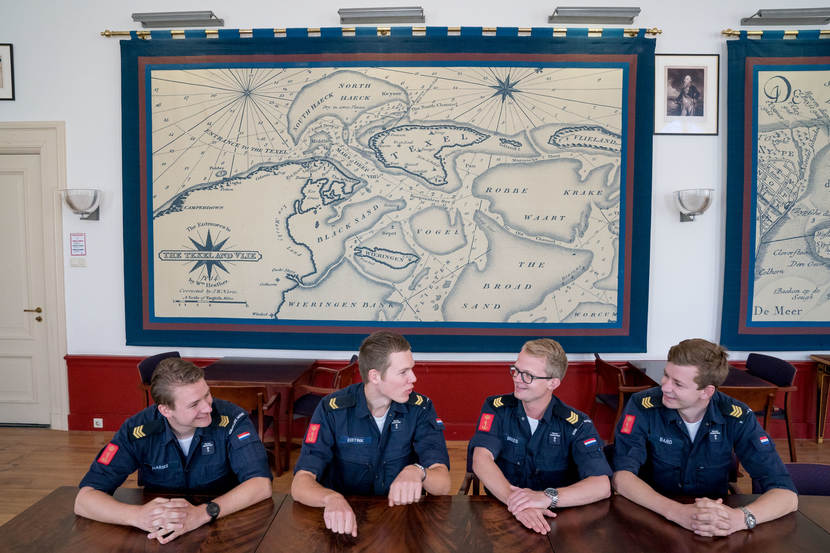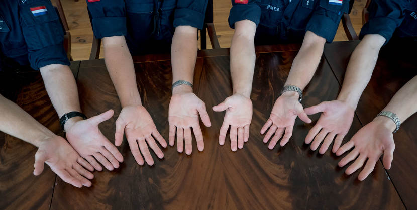 Het viertal kwam onlangs terug in Nederland. Op hun thuisbasis, het Koninklijk Instituut voor de Marine (KIM) in Den Helder, praten ze enthousiast over de bijzondere zeilreis. Demonstratief leggen ze hun handen op tafel. Die laten de sporen zien van 2 weken ouderwets bikkelen aan dek. “We deden dingen die we nog niet eerder hadden gedaan. Zo sta je ineens met 4 man aan een zeil te trekken of ben je een loodsladder in elkaar aan het knopen.”