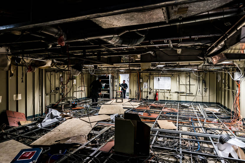 Een leek zal zich afvragen of dit nog wel goed komt. Uit de plafonds hangt een wirwar aan snoeren en leidingen. Dekken liggen open of zijn bedekt met stucloper. De stern ramp(grote klep aan de achterzijde van het schip, red.) en ankerketting liggen los van het schip. “Het komt echt goed, de Rotterdam kan in de loop van volgend jaar weer naar zee”, lacht kapitein-luitenant ter zee (TD) Marcel van der Windt, hoofd Technische Dienst (HTD). “Alles wat problemen veroorzaakte, is eruit gehaald en wordt vervangen of gerepareerd. Zo zijn beide schroefassen ‘getrokken’ om te laten repareren in Denemarken. Ook worden de complete commandocentrale en Amfibische Operatieruimte volledig vernieuwd en geïntegreerd in 1 ruimte. Het schip moet er hierna weer ruim 10 jaar tegenaan kunnen.”