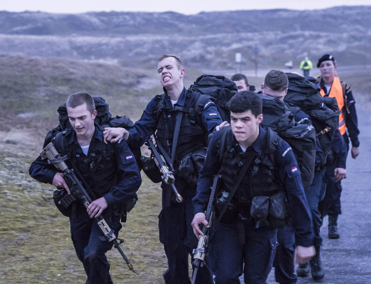 Desnoods op hun tandvlees voltooien matrozen in opleiding de eindoefening ‘Volharding’. (Foto: John van Helvert)