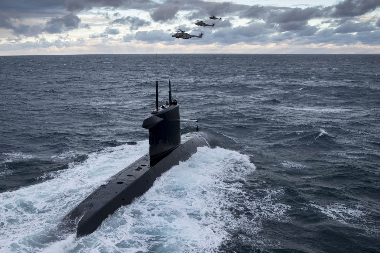 De KM levert 6 weken per jaar een onderzeeboot aan de Engelse Flag Officer Sea Training. De helikopters zijn van het Defensie Helikopter Commando. (Foto: SM Gerben van Es)