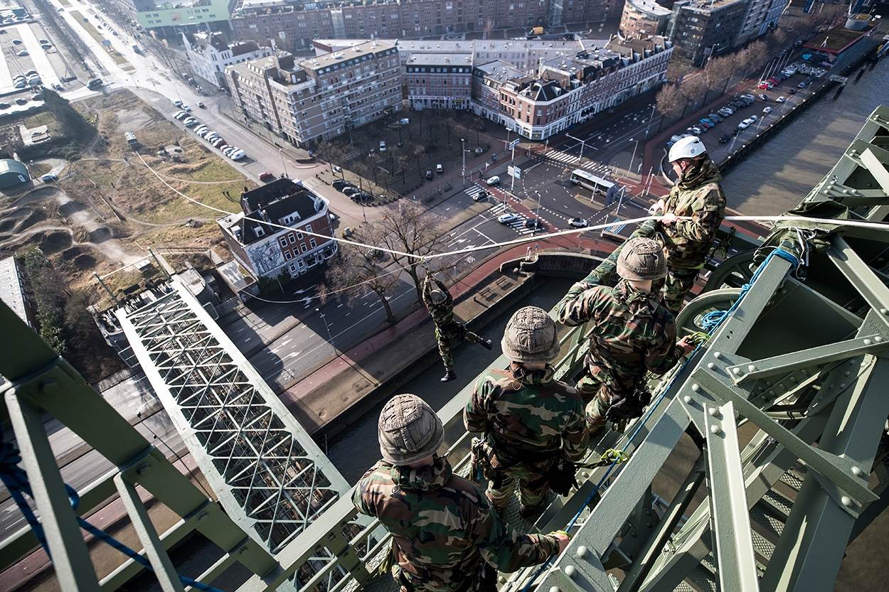 Mariniers in opleiding tokkelen van de Hef in Rotterdam af, tijdens hun Final Exercise. (Foto: KPLDBAV Jasper Verolme)