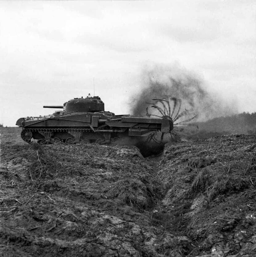 “Een andere belangrijke bijdrage werd geleverd door Hobart’s Funnies. Pantservoertuigen met ongebruikelijke aanpassingen, genoemd naar generaal-majoor Percy Hobart. Het waren veelal tanks die specialistische taken konden verrichten, zoals het onschadelijk maken van mijnen of zich zelfstandig verplaatsen over water.”