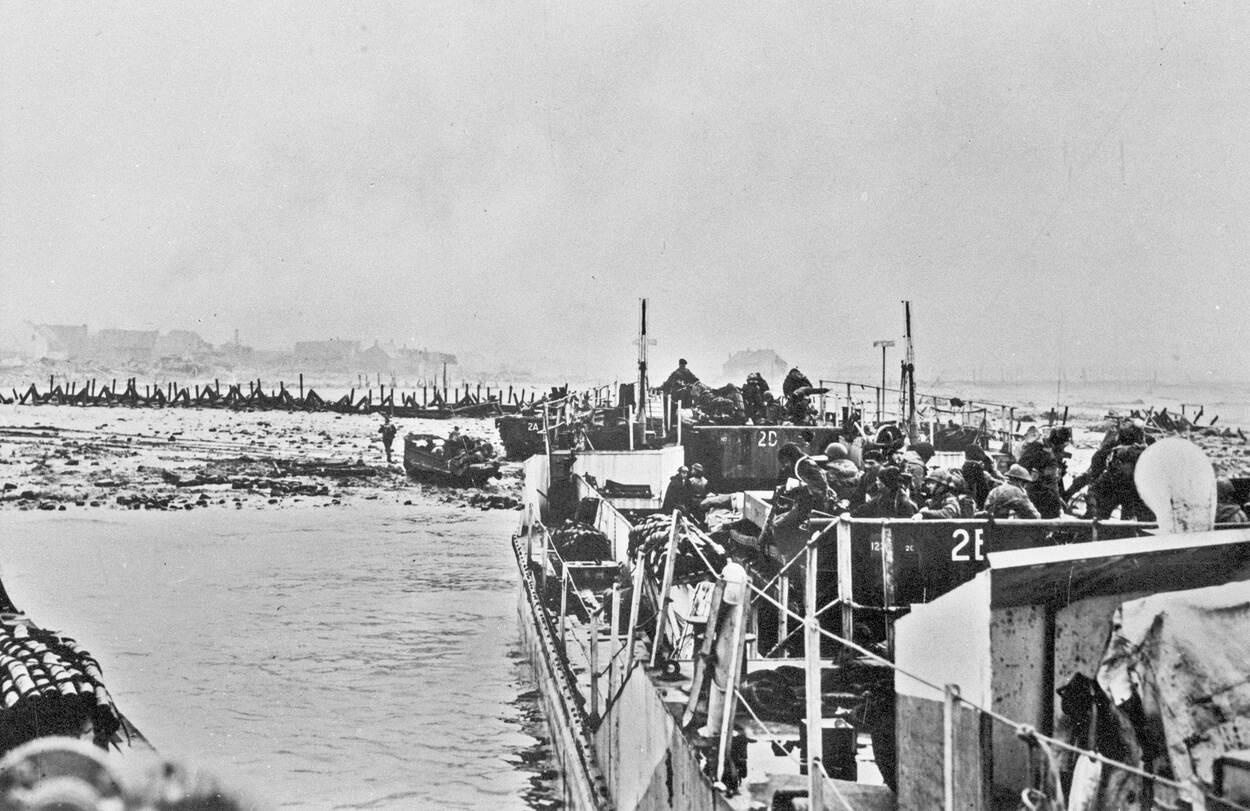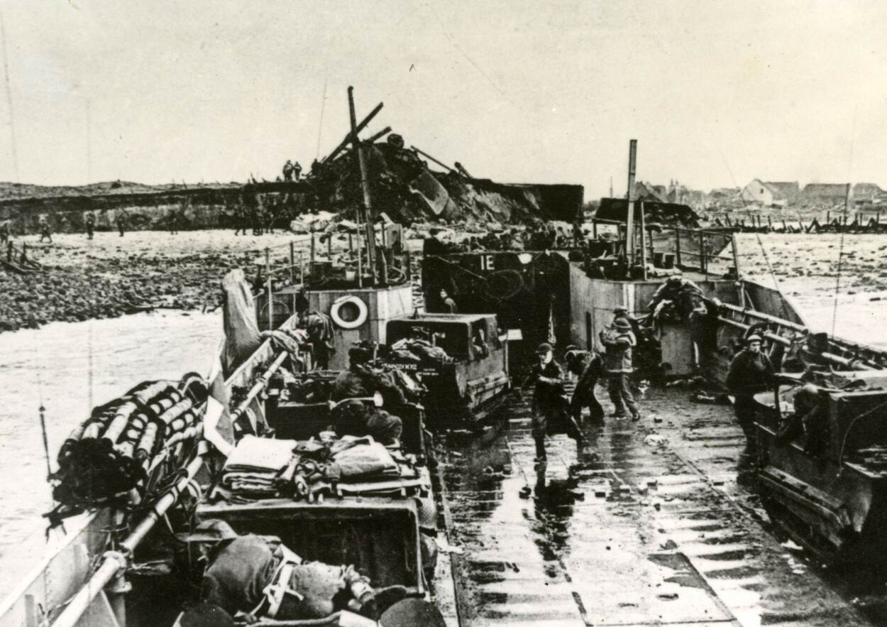 Britse mariniers debarkeren tijdens de invasie van Walcheren met voertuigen en materieel, waaronder Studebaker Weasel amfibievoertuigen, van een LST voor de kust bij Westkapelle.