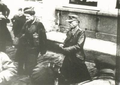 Begeleid door een Canadese officier, begeeft de commandant van de Duitse 70e Infanterie Divisie, luitenant-generaal Wilhelm Daser, zich in gevangenschap.
