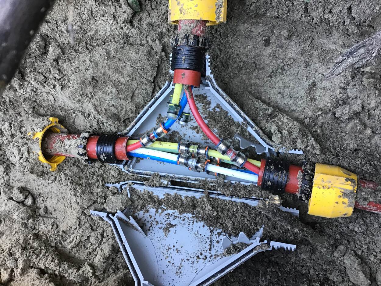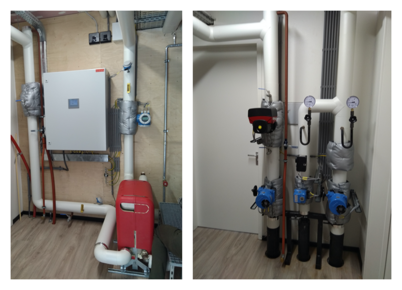 Foto links: De warmtewisselaar brengt warmte over van een vloeistof of gas naar een ander onderdeel. | Foto rechts: Het warmwaternet dat van leidingen in de grond overgaat naar het gebouw.