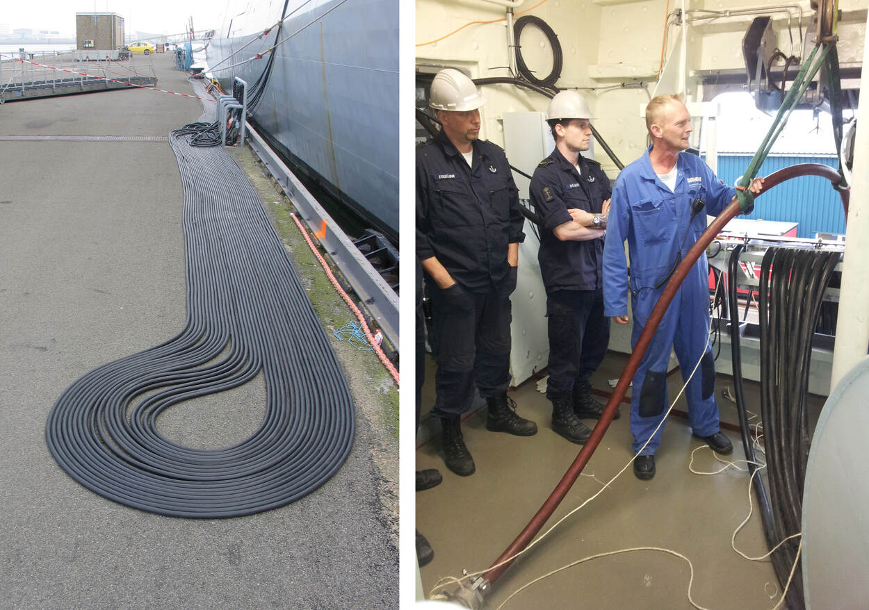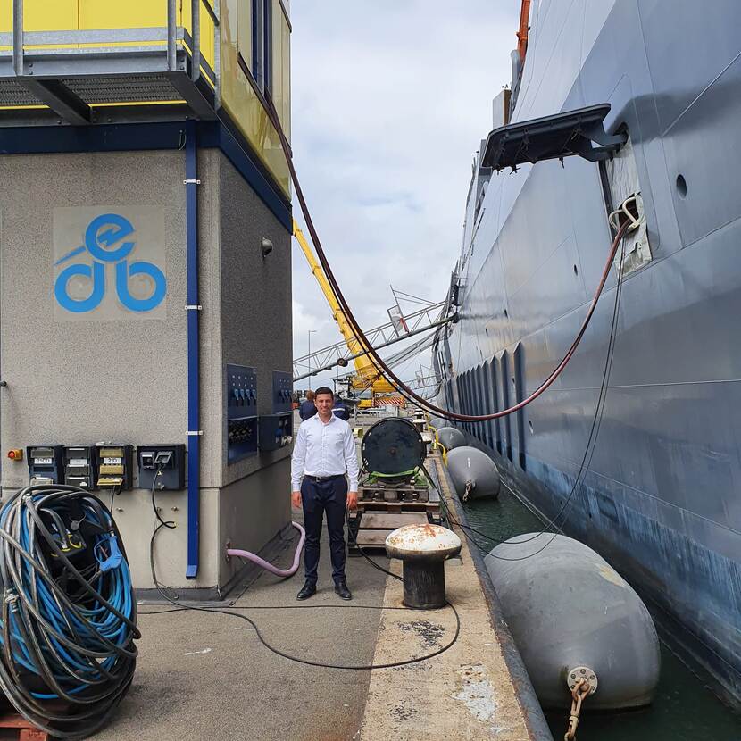 Davey Genemans, hoofd Bedrijfsvoering EDB, bij de energievoorziening die met hoogspanningskabels een marineschip van walstroom voorziet.