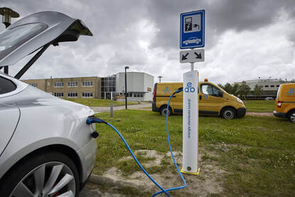 De elektrische laadpalen waarvan het EDB op het terrein de uitrol verzorgt en het energieverbruik en gedrag van de gebruikers vastlegt. De gebruikers zijn het personeel en externe partijen die hier alleen privéauto’s op kunnen laden.