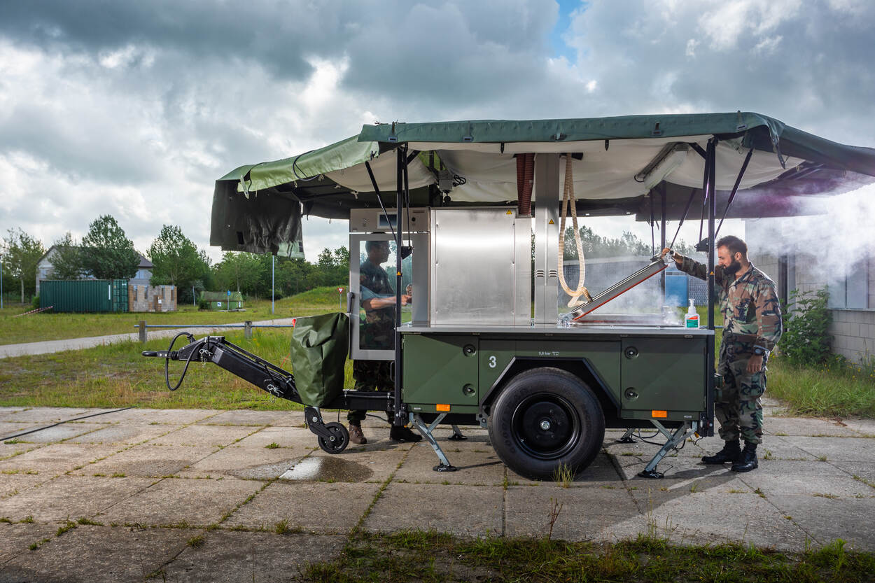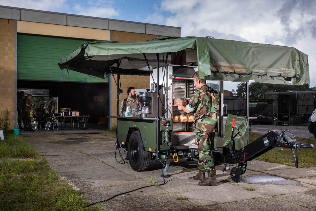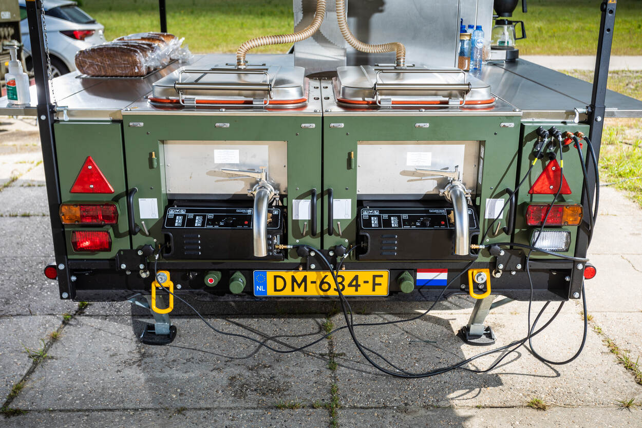“Het nieuwe apparaat bestaat uit een gemoduleerd systeem, met 4 kookposities, in plaats van 2”, vervolgt Van Dijk. “Naast kookketels, zijn er ook 2 braadbakken. En de dubbelwandige uitvoering van de ‘pannen’ zorgt voor een betere warmtegeleiding en -verdeling. Ook is de nieuwe kombuiswagen minder storingsgevoelig en tegelijkertijd gebruiksvriendelijker dan de voorganger. Zo worden de kerosinebranders bijvoorbeeld automatisch schoongemaakt. Dat hoef je dan niet meer constant met de hand te doen. Ten slotte is de overkapping geïntegreerd in de wagen, dus heb je geen aparte tent nodig. Het is: uitklappen en aan de gang.”